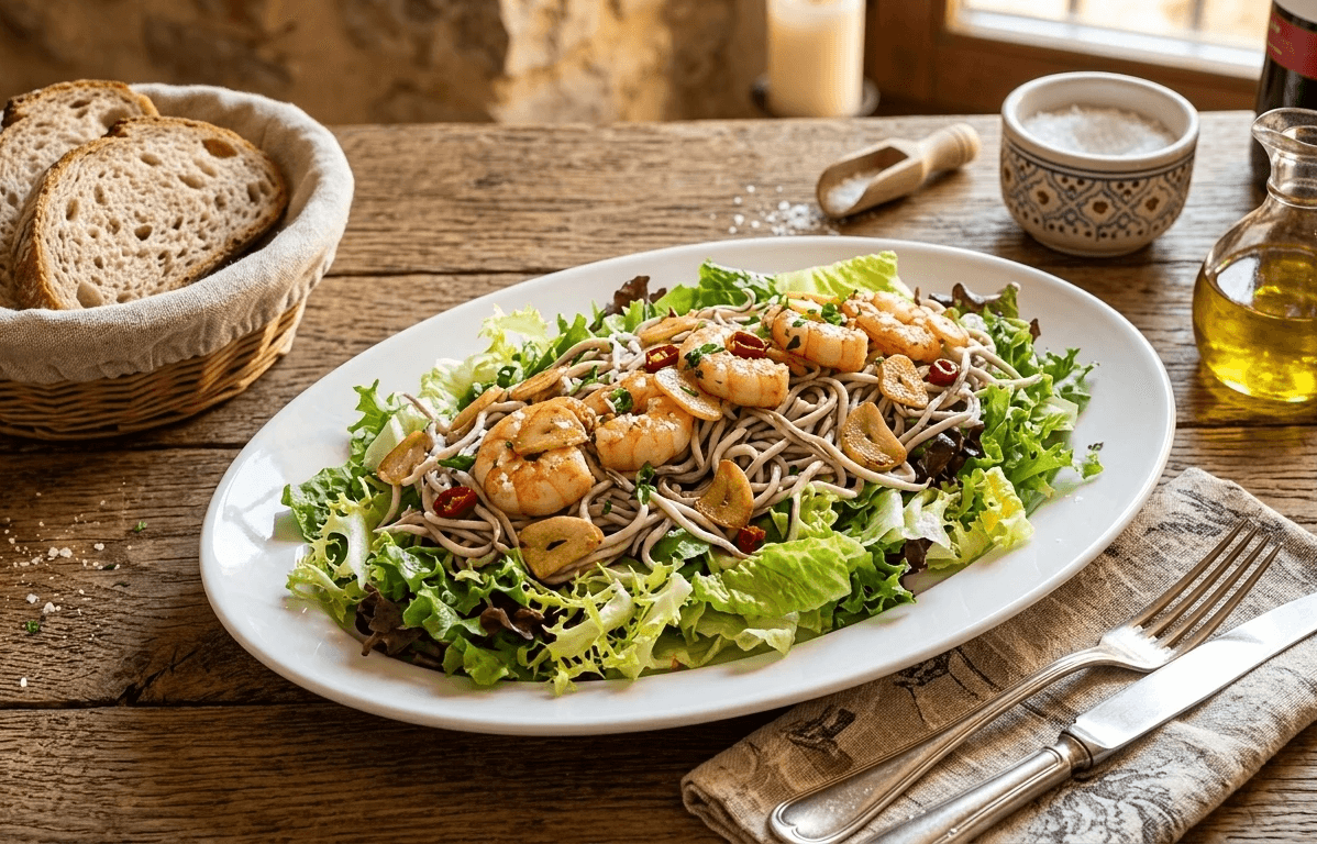 Ensalada templada con gulas y gambas salteadas al ajillo, con ajo laminado, aceite de oliva, servidas sobre lechuga fresca aliñada. Un plato rápido, ligero y saludable, perfecto como entrante o cena informal.