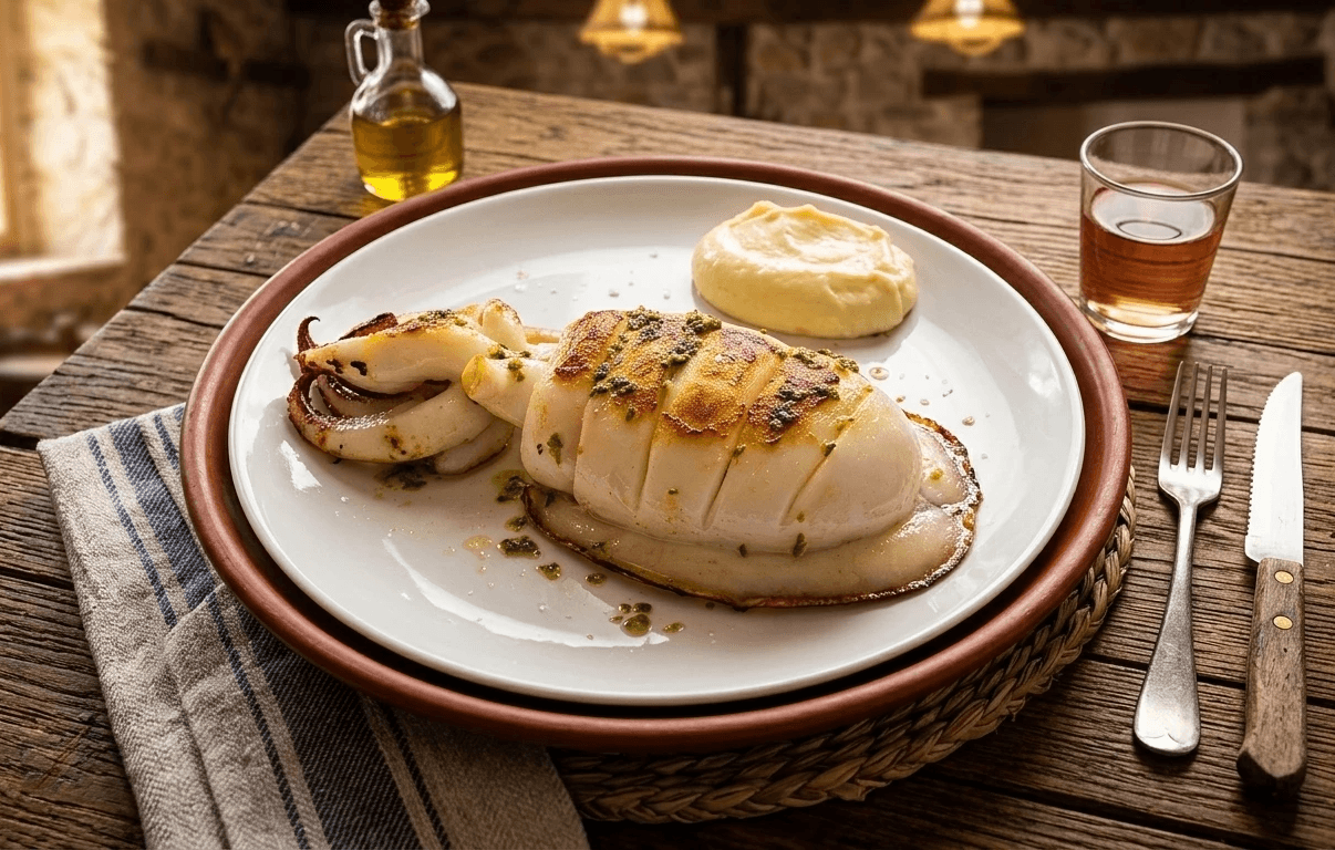 Tierna sepia a la plancha, cocinada con un chorro de aceite de oliva virgen extra, ajo picado fresco, perejil abundante y un toque de sal marina que realza su sabor intenso, evocando el frescor del mar Mediterráneo en cada jugoso bocado.
