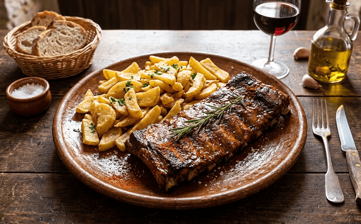 Costillas de cerdo asadas lentamente al horno, carne tierna que se separa del hueso, bañada en sus propios jugos y aromas intensos de hierbas provenzales. Acompañadas de jugosos pimientos asados y crujientes patatas fritas doradas.