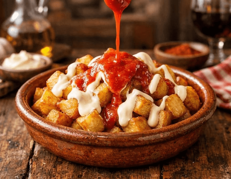 Dados de patata frita, crujientes por fuera y tiernos por dentro, bañados con una salsa de tomate casera con pimentón picante y rematados con un toque de mayonesa suave, que aporta cremosidad y equilibra el sabor con un final delicioso.