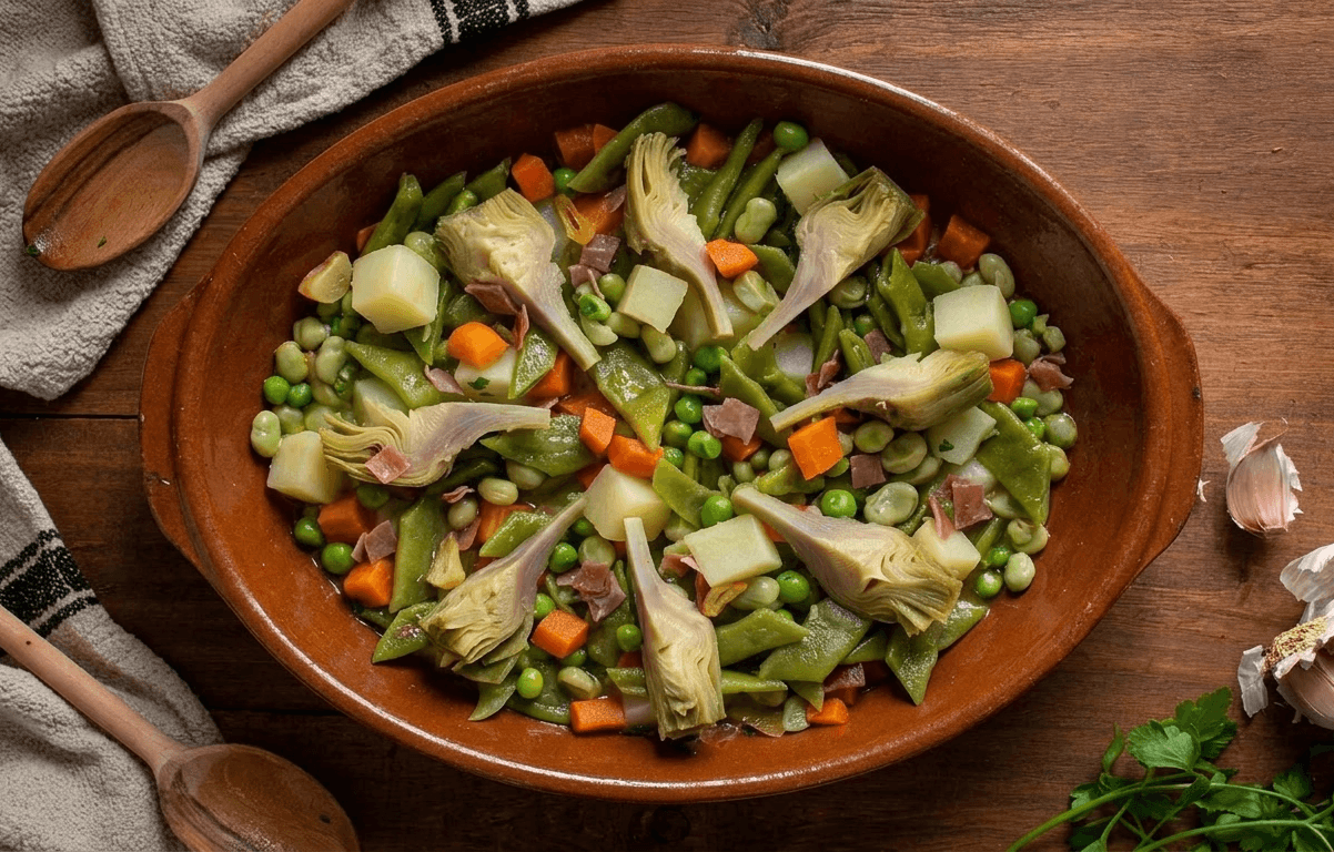 Guiso de verduras hervidas que combina la suavidad de los espárragos, alcachofas, zanahorias y judías verdes. Todo ello se potencia al ser pochadas en aceite con ajo, el toque salado del jamón y la textura del huevo duro final.