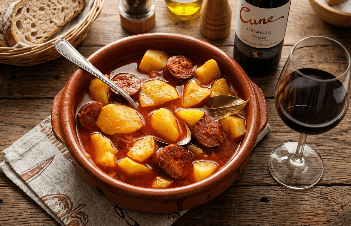 Esta sopa tradicional se elabora con patatas chascadas de gran calidad, chorizo riojano que aporta su característico sabor ahumado, pimiento choricero, cebolla, ajo y pimentón, todo cocinado a fuego lento en un sofrito con aceite de oliva y sal.